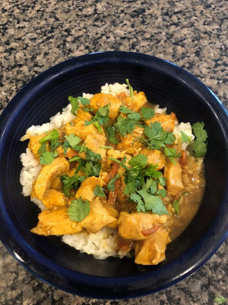 Simmer the sauce over medium heat, stirring occasionally, until the chicken is fall-apart tender and the sauce thickens - about 20 minutes. Serve warm over rice with chopped cilantro.