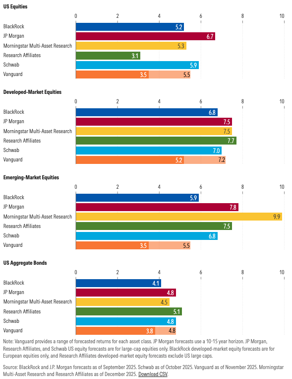 Because of the short-run variability of stock market returns, I steer clients away from short-term tactical changes to their portfolios and prefer to rely on the weighty evidence of history and long-term market trends. While no one has consistently and accurately predicted what the stock market is about to do, several well-respected firms provide long-term outlooks that have proven to be more accurate than short-term predictions.