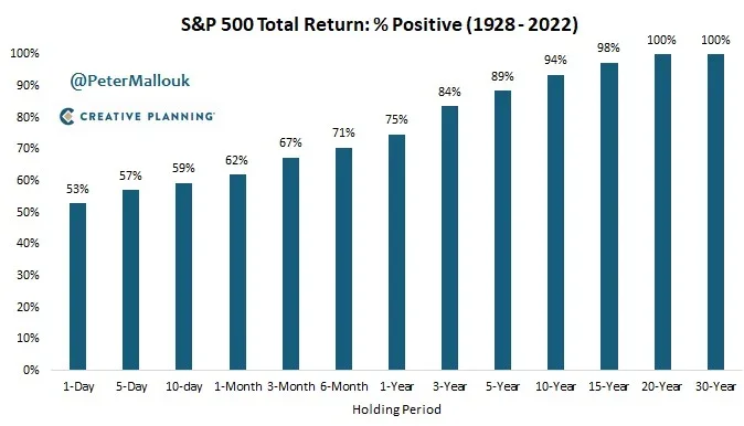 If you log into your financial accounts every day, the stock market will feel quite random. Up, down, sideways, completely unpredictable. You only have about a 50/50 chance of seeing green on any given day, 53% to be exact (see below).
