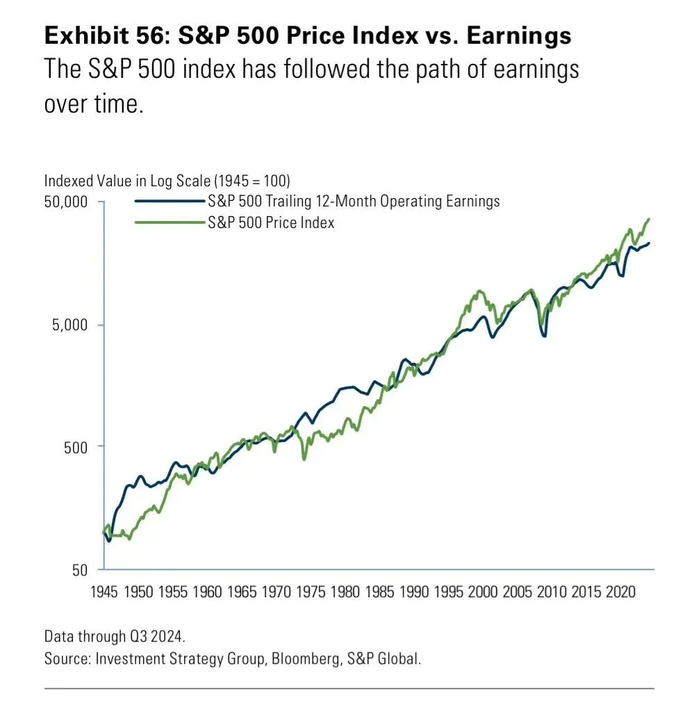 Since 1945, the S&P 500 (light green) and S&P 500 Trailing 12-Month Operating Earnings (dark green) have moved together in remarkable harmony. They drift apart occasionally during bubbles and crashes, but in the long run, prices keep coming back to where earnings are headed.