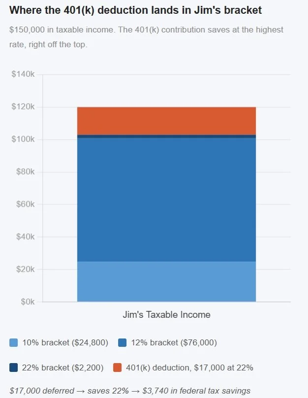 The 401(k) contribution peels right off the top of Jim's 22% bracket, and it is as clean a dollar-for-dollar exchange as you will find in the tax code.