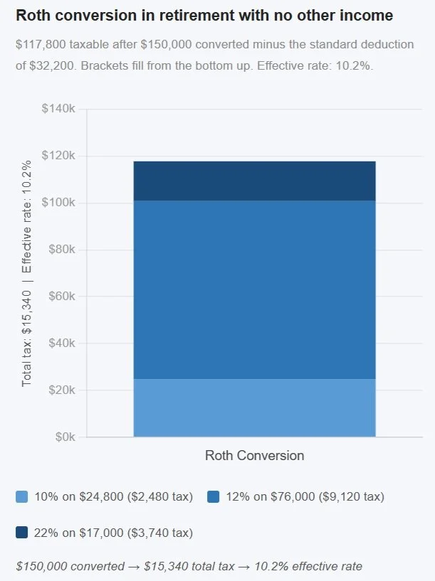 When Jim converts $150,000 with no other income, not all of that amount is taxed at 22%. It starts from the bottom of the bracket structure and works its way up. The first $32,200 is tax-free (via the standard deduction). The next $24,800 is taxed at 10%. The next $76,000 is taxed at 12%. Only the final $17,000 reaches the 22% bracket at all.