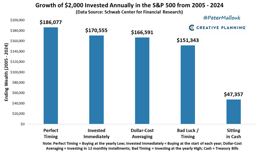The chart above highlights how $2,000 invested annually in the S&P 500 from 2005 to 2024 would have performed under different timing strategies: