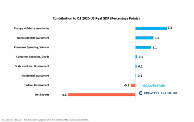 A single headline can move the market, but sometimes, the numbers behind those headlines are more complicated than they appear. The first quarter of 2025 offers a perfect case study. U.S. GDP declined by .3% in Q1, sparking fears of a looming recession. While that may certainly materialize, a closer look at the data shows a different story. The decline was not due to changes in consumer spending or investments, it was due almost entirely by “net exports.” When the US imports more than we export to other countries, it is a drag of growth. We imported significantly more in the Q1 than we exported.